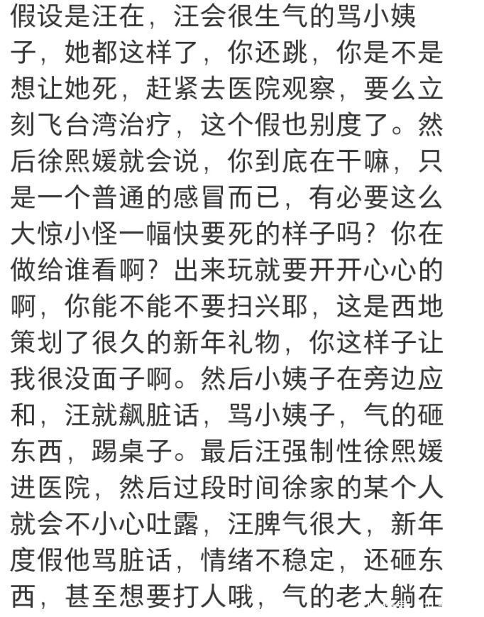 就像网友说的那样,如果汪小菲在身边,大S就不会死。有网友根据汪小菲、小S和S妈以前做事的风格,以及说话的语气,假设了一下如果这次汪小菲也跟着去旅行了,他看到大S生病会如何说话,如何做。