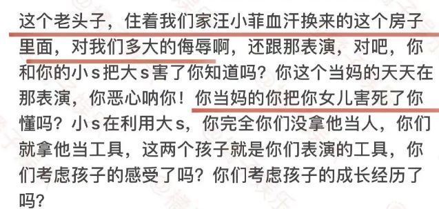当时看到这段并没有觉得如何,可后来汪小菲和大S离婚后,汪小菲的妈妈张兰也曾在自己的发文中说过类似的话。张兰说,S妈她自己把女儿(大S)害死了,小S在利用大S。张兰还说,S妈和小S都没有把大S当人,而是把她当工具。