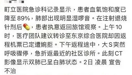 2月1日下午返程途中,大S突然呼吸骤停,急折返至最近的社区诊所治疗,当时CT影像显示双肺已成白肺状态。
